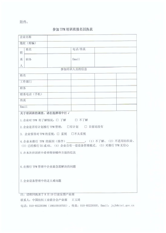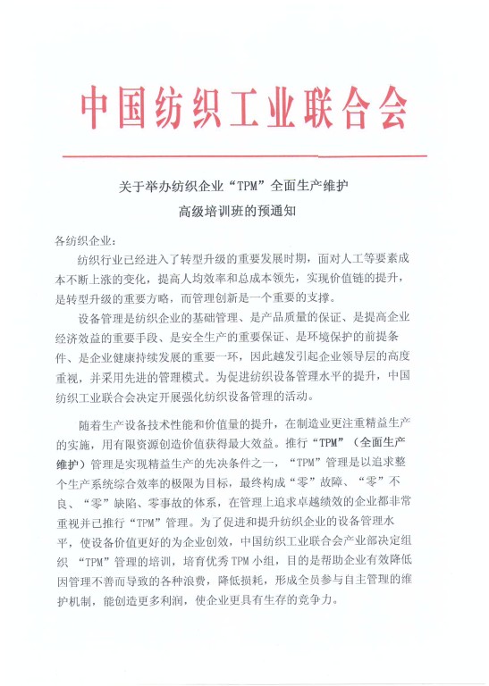 關(guān)于舉辦紡織企業(yè)“TPM”全面生產(chǎn)維護(hù)高級(jí)培訓(xùn)班的預(yù)通知