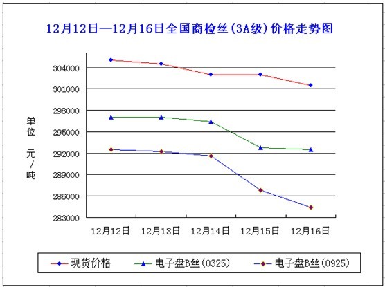本周現(xiàn)貨絲價延續(xù)上周末跌價走勢,并且繭絲市場比上周更為悲涼,屬于單個方向走低行情,而上周最起碼受外圍經(jīng)濟因素利好,市場還有一次短暫的回暖。國內(nèi)3A級現(xiàn)貨商檢絲周初均價305000元/噸,周末現(xiàn)貨均價301500元/噸,跌價較為明顯,跌3500元/噸,整體跌幅1.14%,此跌幅屬于近段時間以來幅度最大的一周。就本周曲線走勢來看,屬于直跌狀態(tài),中間沒有出現(xiàn)回暖等行情,因此對市場的悲觀影響較為嚴(yán)重。區(qū)域來看,兩廣絲價出現(xiàn)明顯回落,周末均價已經(jīng)回落至30.1萬/噸左右;江浙緯線絲也做向下盤整,整體成交價均回落至30萬/噸以內(nèi)。從市場方面來看,嘉興市場綜合指數(shù)要略高于廣西市場,但差價較大。從本周環(huán)境來看,臨近年關(guān),越來越多的企業(yè)開始收工放假,另外雖有企業(yè)在年底時候會進行采購補庫,但受近期繭絲市場持續(xù)悲涼影響,多以觀望為主。下游消費依然中規(guī)中矩,沒有得到實質(zhì)解決,上游市場顯然得不到行情支撐。