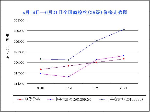 從圖表可以看出,本周現(xiàn)貨市場成偏強盤整,且本周價格基本處于小幅直漲行情,雖然前后價格走勢并不明顯,漲幅也不大,但對后世影響較為有利,對于近期一直疲軟的繭絲市場來講無疑是提供了價格支撐。本周價格:國內(nèi)3A級商檢絲現(xiàn)貨均價周初318000元/噸左右,隨后價格一路微幅上行,周末均價在321000元/噸左右,整體漲價3000元/噸。本周繭絲市場的影響主要來有幾個方面:一是新繭方面,隨著前幾批繭子的逐漸推出市場,后來的廣西一帶的三、四批繭子,以及江浙一帶的二、三批繭子,不論是在質(zhì)量還是產(chǎn)量上都不樂觀——質(zhì)量的下滑意味著收購價提升不上去,而產(chǎn)量的驟然減少也表明行情將得到支撐。由此,一利一空,而產(chǎn)生了現(xiàn)在這種膠著行情;而是生產(chǎn)消費情況,據(jù)媒體消息,隨著夏季的來臨,企業(yè)生產(chǎn)加大,而常規(guī)的絲綢消費季也來臨,每年夏季將是絲綢產(chǎn)品最熱銷的時候,由此對上游產(chǎn)生一定的利多影響,但受經(jīng)濟形勢影響,影響微弱,因此行情只是做偏強盤整;再有就是市場的調(diào)節(jié)性,基本近兩個月以來,繭絲市場都呈現(xiàn)下跌走勢,隨著新繭的沒落,資金流將逐漸流入盤面,市場方面也會做相應(yīng)調(diào)整,行情的到一定支撐。