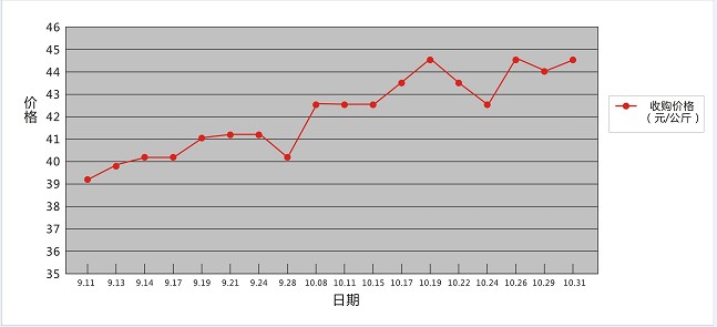 本月廣西第三、第四批秋繭陸續(xù)上市,全國(guó)其他蠶區(qū)晚秋蠶也進(jìn)入飼養(yǎng)及收烘階段。由于今年受到干旱、蠶病的影響比較普遍,上半年蠶繭產(chǎn)量、質(zhì)量均不大樂(lè)觀。大家把希望寄托在秋繭上,然而雨水不濟(jì),桂南秋蠶飼養(yǎng)早早進(jìn)入尾聲,這更增加了行業(yè)對(duì)減產(chǎn)的心理暗示。一邊是繅絲產(chǎn)能的不斷擴(kuò)張,一邊是原料可能性的減產(chǎn)。蠶區(qū)蠶繭收購(gòu)競(jìng)爭(zhēng)進(jìn)入白熱化,價(jià)格不斷被拉高。以下是廣西宜州德勝蠶區(qū)秋繭收購(gòu)走勢(shì)圖: