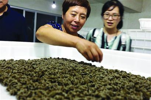 合作社負責(zé)人高愛芬?guī)ьI(lǐng)記者首先來到小蠶室。一個個可折疊起來的長方形白色塑料筐里,小蠶正在歡快地吃著一些小條塊狀飼料。“以前桑葉一天起碼喂兩次,現(xiàn)在一齡(三天)只需喂一次,省工又省力,這次15張小蠶種都是我一個人在養(yǎng)。”高愛芬說,在這里,小蠶吃的是專門特制的飼料。