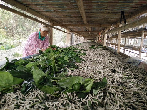 工人正在喂養(yǎng)晚秋蠶。通訊員 種統(tǒng)強(qiáng) 供圖