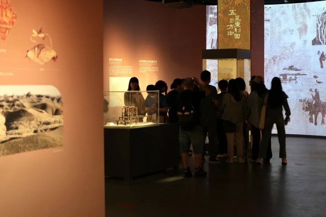 第三單元“絲路梵音”不僅呈現(xiàn)了絲路佛教文化的融合交流,還復(fù)原了克孜爾石窟17號窟美景,為觀眾打造了沉浸式觀展體驗(yàn)。而尾廳“絲路交融”,則創(chuàng)造性地展示以蜀錦為媒介的絲路文化交流,彰顯中華文明的開放與包容。