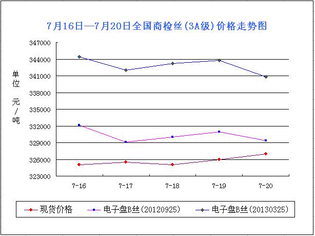 從圖表可知,本周現(xiàn)貨市場漲跌互現(xiàn),整體盤整,價格位重心上移,較之前段時間的行情有不小漲幅,而就本周而言,行情較為平淡。從近段時期的價格走勢而言,自新繭基本交售結(jié)束后,繭絲市場便呈現(xiàn)出回暖基調(diào),雖然基本都是處于盤整——漲跌互現(xiàn)的局面,但整體大趨勢是在上漲,且漲幅近至近日已經(jīng)不小,因此這對于整個繭絲市場來講無疑是有后市支撐力的,雖然如今在市場或者企業(yè)間,大多人都處于看空思想,但此一段的行情上漲在一定程度上支撐了市場的走勢。本周價格:國內(nèi)3A級商檢絲現(xiàn)貨均價周初325000元/噸左右,隨后價格小漲,周末均價在327000元/噸左右,整體漲2000元/噸。本周價格周末已經(jīng)漲至32.5萬/噸以上,這樣的趨勢來看,33萬/噸很有可能在近日達(dá)到,但33萬/噸的坎卻是很難邁過,行情以后亟需謹(jǐn)慎。從坊間消息得知,近周以來,廣西地區(qū)夏繭收購基本處于尾部,伐桑工作也進(jìn)行的熱火朝天,預(yù)計近期上半年桑蠶工作將基本結(jié)束,而整體來看,繭絲行情有定型趨勢