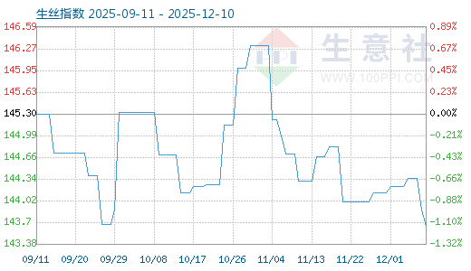 12月8日生絲(國內(nèi)商檢絲)商品指數(shù)為91.45,較昨日下降了0.04點,較周期內(nèi)最高點121.00點(2013-07-23)下降了24.42%,較2015年09月29日最低點88.34點上漲了3.52%。(注:周期指2011-09-01至今)