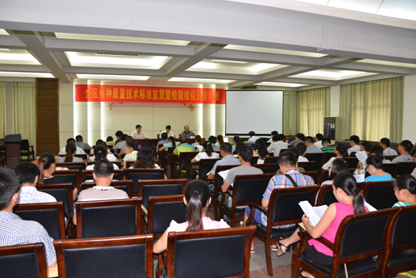 2013年6月3-6日,廣西蠶種質(zhì)量檢驗(yàn)檢疫站在南寧舉辦全區(qū)蠶種質(zhì)量技術(shù)標(biāo)準(zhǔn)宣貫暨檢驗(yàn)檢疫員培訓(xùn)班。全區(qū)30家蠶種生產(chǎn)單位的質(zhì)量負(fù)責(zé)人和檢驗(yàn)人員,以及廣西蠶業(yè)技術(shù)推廣總站蠶種生產(chǎn)技術(shù)干部共60多人參加了培訓(xùn)學(xué)習(xí)。自治區(qū)農(nóng)業(yè)廳謝東副廳長(zhǎng)出席開(kāi)班儀式并講話,開(kāi)班儀式由廣西蠶種質(zhì)量檢驗(yàn)檢疫站祁廣軍站長(zhǎng)主持。