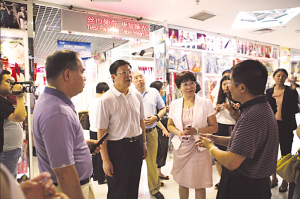 圖為中國(guó)絲綢協(xié)會(huì)會(huì)長(zhǎng)楊永元(左二)、北京秀水街市場(chǎng)有限公司董事長(zhǎng)張永平(左一)與絲綢企業(yè)家參觀秀水市場(chǎng)。