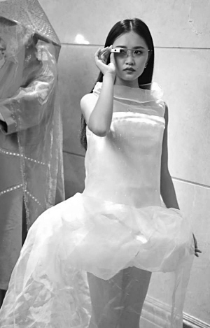 圖為西南大學(xué)紡織服裝學(xué)院學(xué)生李心逸展示的交互式可穿戴計(jì)算成衣,設(shè)計(jì)者是清華大學(xué)信息藝術(shù)設(shè)計(jì)系博士覃京燕。這套衣服由光纖織造,可以根據(jù)空氣霧霾大數(shù)據(jù)和人體生理數(shù)據(jù)及觀眾反應(yīng)作出交互式響應(yīng)!″X明亮 攝