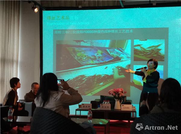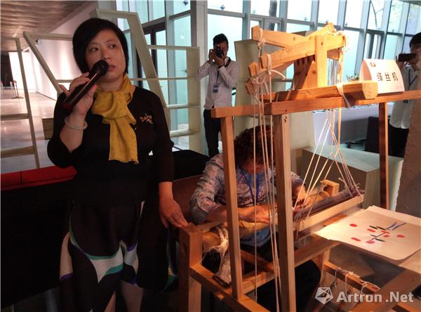 新聞通氣會(huì)現(xiàn)場(chǎng),策展人LINDA介紹緙絲藝術(shù)及工藝。