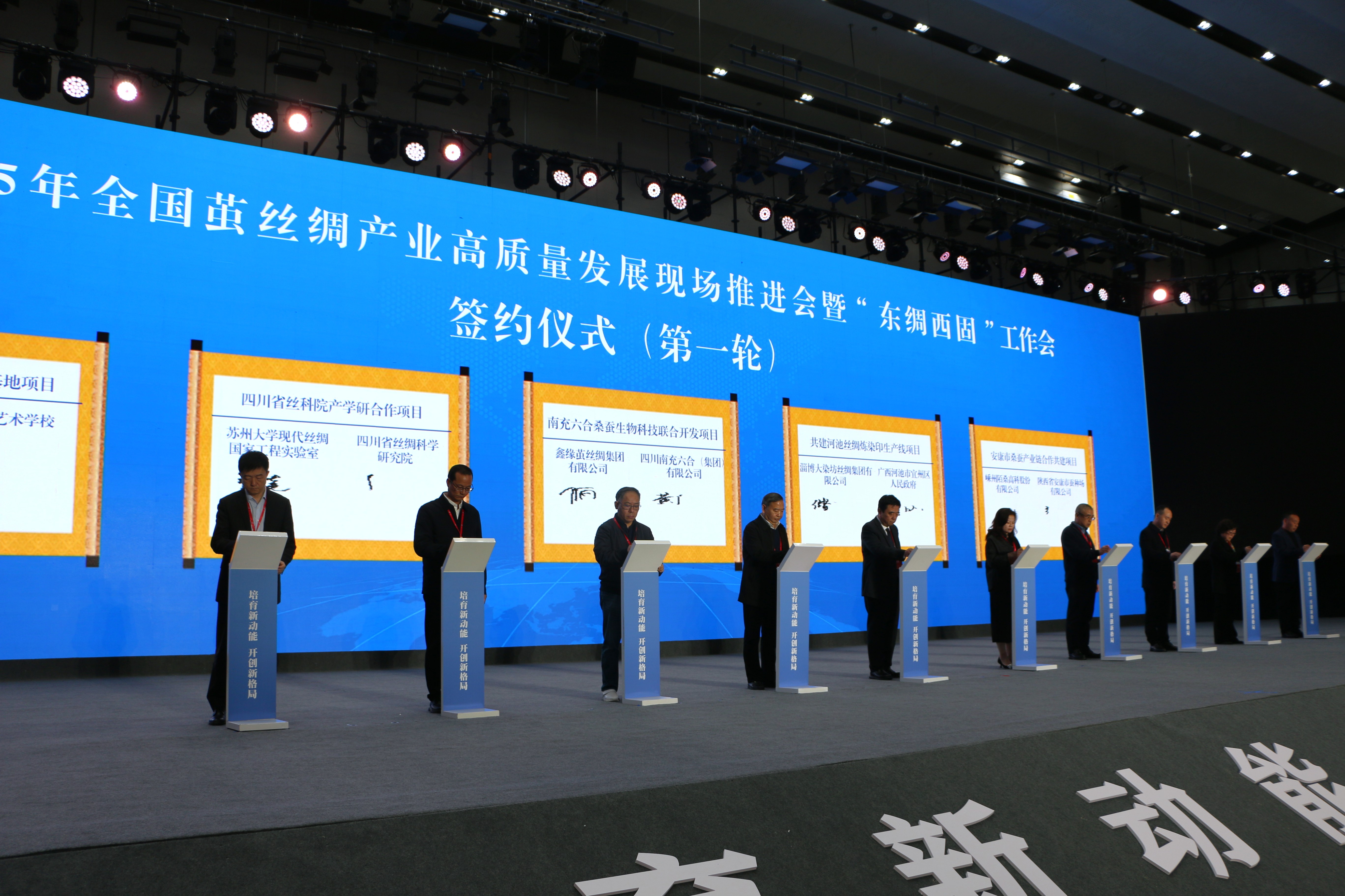 會(huì)議同步舉辦“東綢西固”東西部產(chǎn)業(yè)協(xié)作簽約儀式,東部高校機(jī)構(gòu)、品牌公司、龍頭企業(yè)與中西部蠶;乜h、科研院所、鏈主企業(yè)簽約合作。合作內(nèi)容涵蓋技術(shù)研發(fā)、品牌共建、供應(yīng)鏈優(yōu)化和產(chǎn)學(xué)研融合等多個(gè)領(lǐng)域。此舉將推動(dòng)?xùn)|部資本、技術(shù)、市場(chǎng)優(yōu)勢(shì)與西部原料、土地、勞動(dòng)力優(yōu)勢(shì)有效對(duì)接,構(gòu)建跨區(qū)域產(chǎn)業(yè)協(xié)同格局,為落實(shí)國(guó)家區(qū)域協(xié)調(diào)發(fā)展戰(zhàn)略、培育新質(zhì)生產(chǎn)力注入動(dòng)能。在遴選的10對(duì)簽約單位中,四川省有6家單位參加簽約,其中,四川省絲綢科學(xué)研究院黨委書(shū)記、董事長(zhǎng)、總經(jīng)理程明代表本單位與蘇州大學(xué)現(xiàn)代絲綢國(guó)家工程實(shí)驗(yàn)室簽約,四川錦門實(shí)業(yè)發(fā)展有限公司董事長(zhǎng)吳金良代表本單位與蘇州隆鵲絲綢有限公司簽約,寧南縣南絲路集團(tuán)黨委書(shū)記、董事長(zhǎng)林平代表本單位與江蘇華佳控股集團(tuán)有限公司簽約,此次簽約不僅深化了東西部地區(qū)的產(chǎn)業(yè)鏈接,更將為中西部地區(qū)的鄉(xiāng)村振興和產(chǎn)業(yè)升級(jí)提供強(qiáng)大助力。